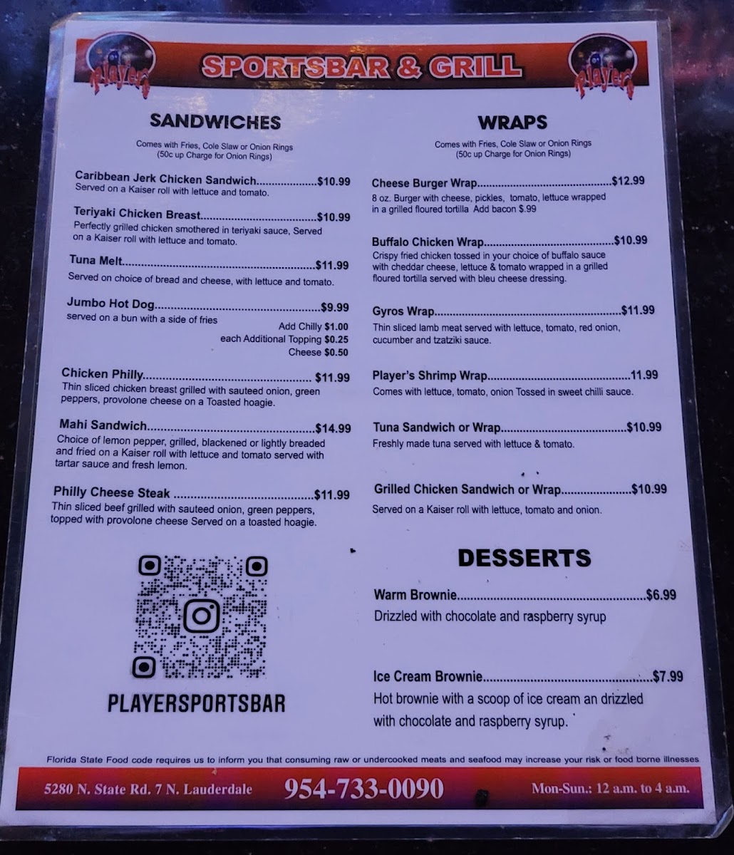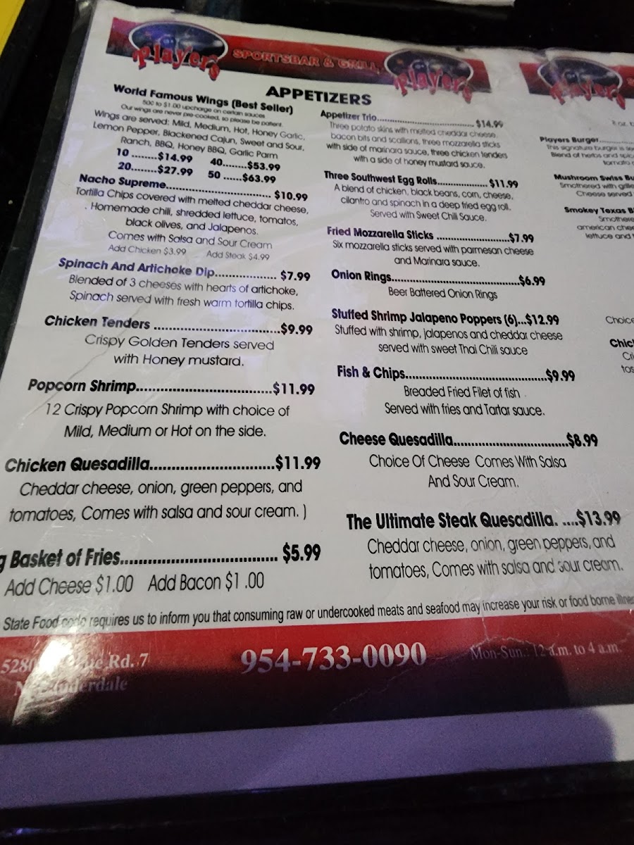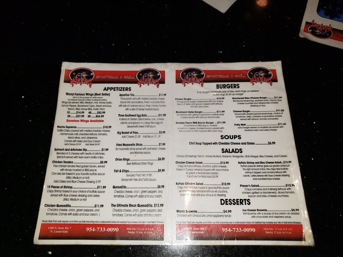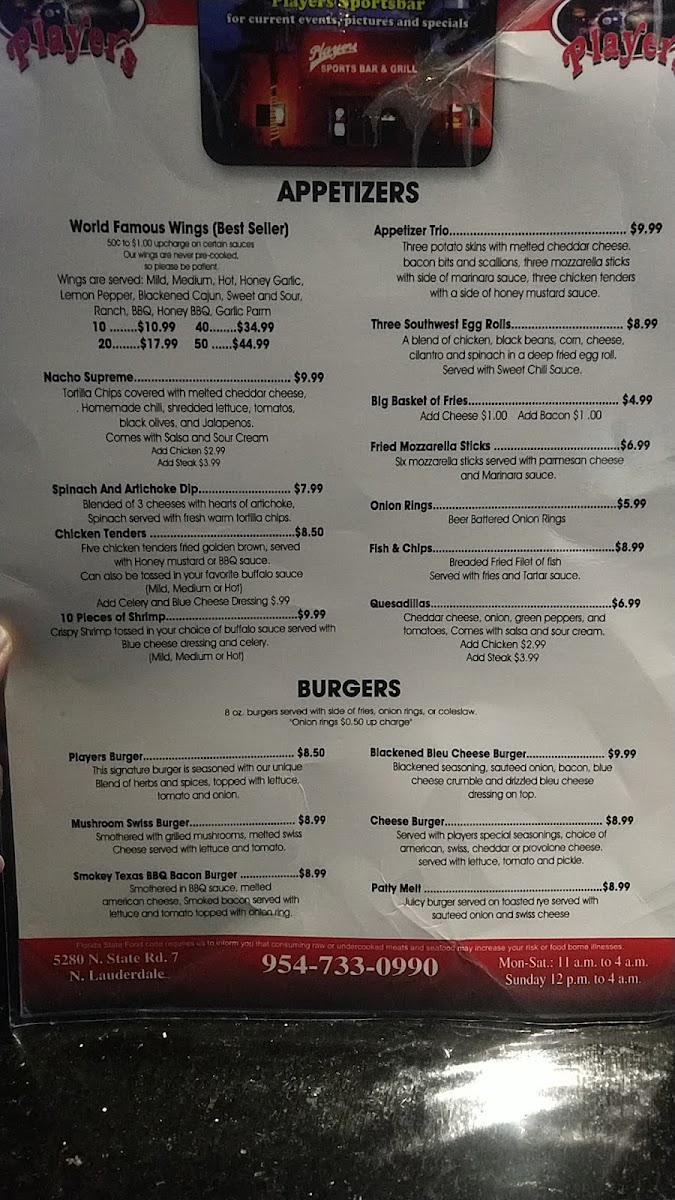 Players Sports Bar & Grill Menu