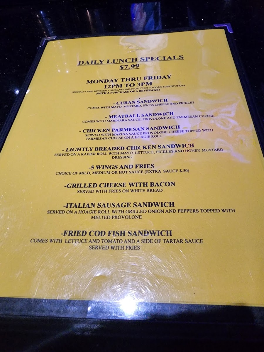 The menu is suitable for lunch, casual dinners, and late-night meals, providing a range of lighter options like wraps and salads as well as more substantial choices such as burgers and wings. Visitors often use the menu for quick orders or relaxed dining while enjoying the sports bar environment.
